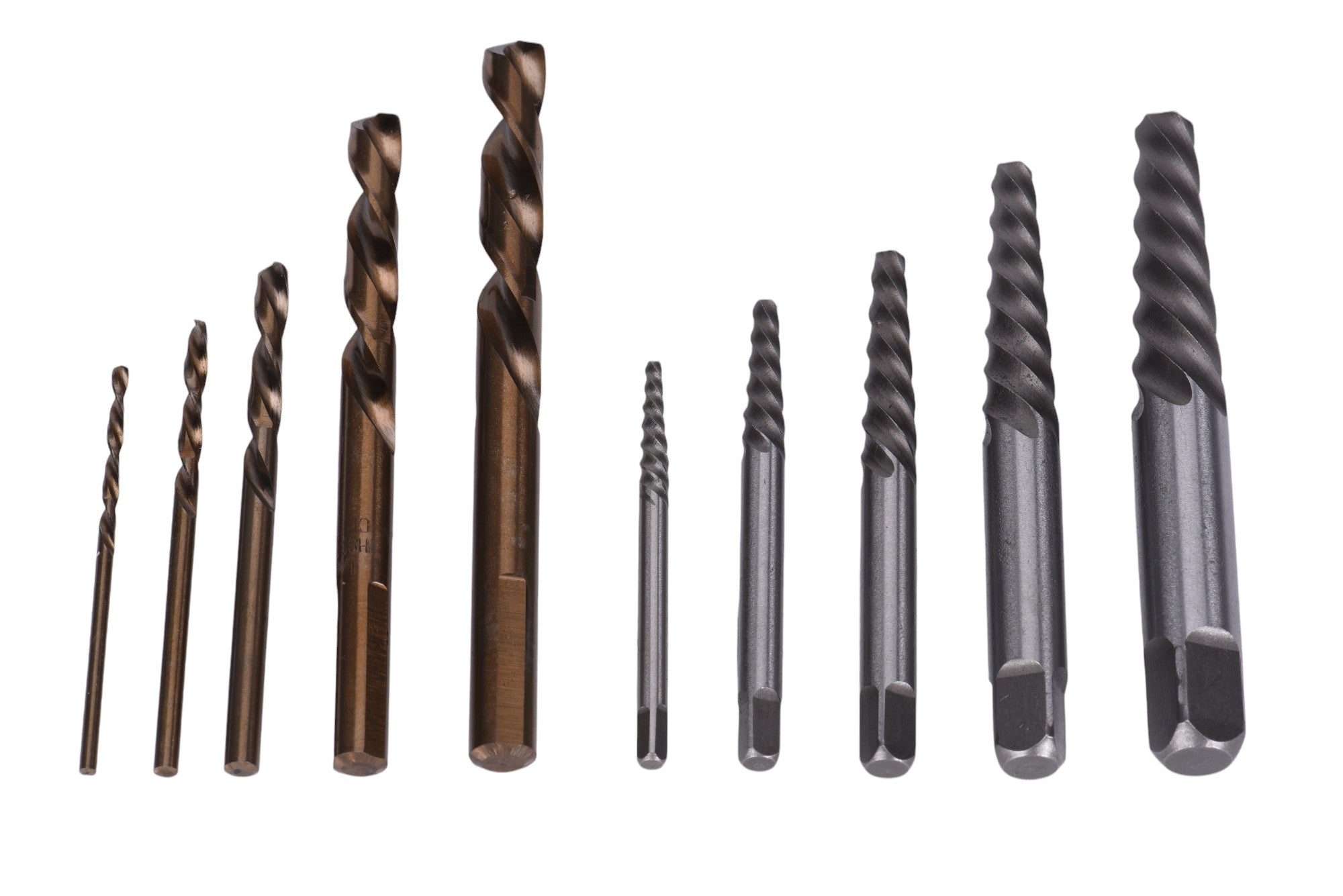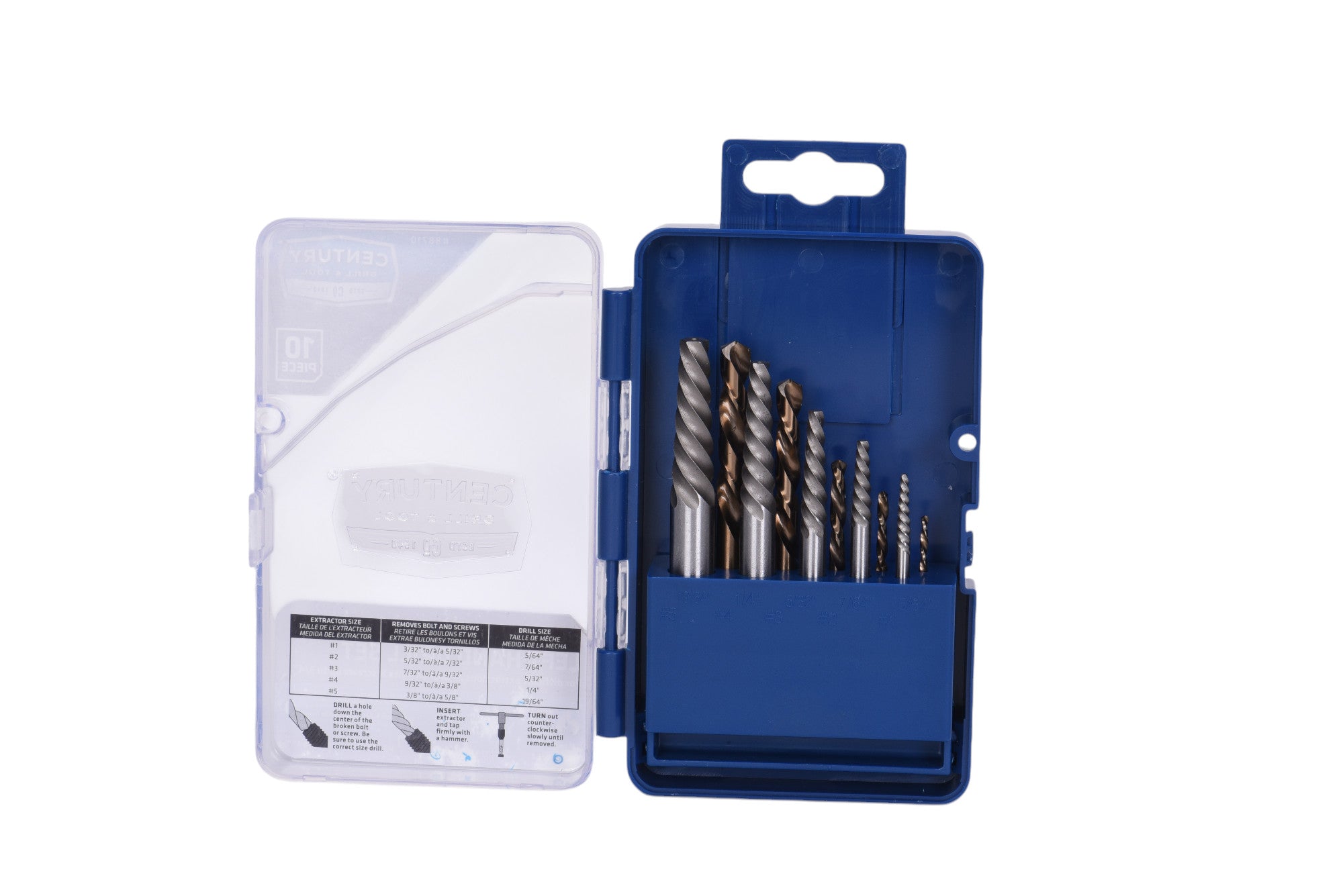 - Set includes: 5/64", 7/64", 5/32", 1/4", and 19/64" left hand drill bits, and #1, #2, #3, #4, and #5 spiral screw extractors.