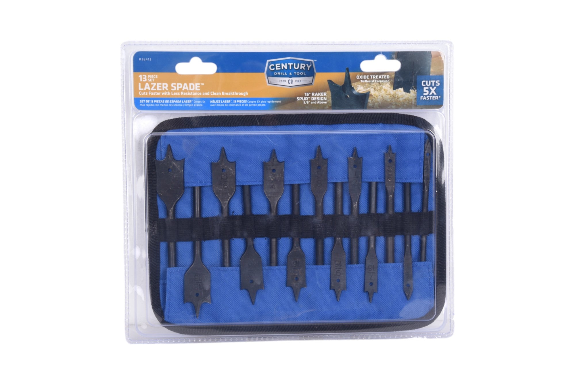 - Raker spurs form a high speed cutting wedge that bores faster, smoother finished holes (5/8" and above only).