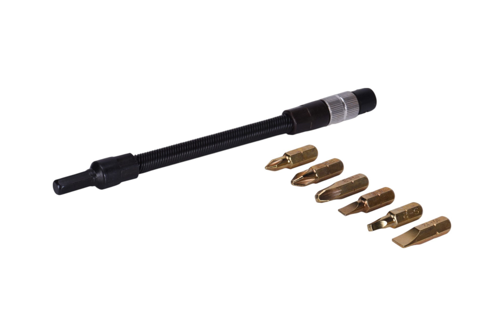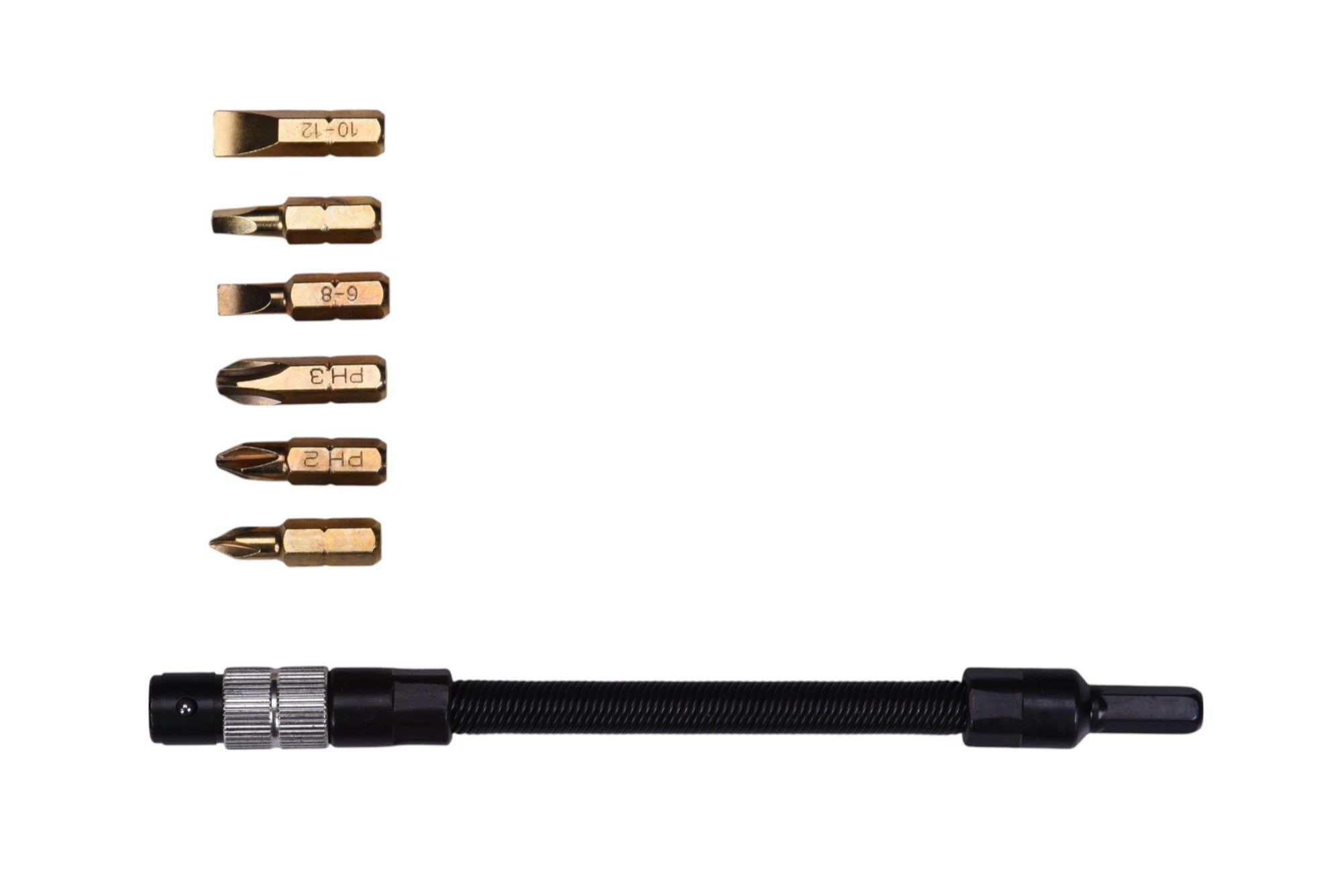 - Set includes: Insert Bits(1/ea.) Phillips #1, #2, #3, Slotted #6-8, #10-12, Square #2, and 6" Extensions.